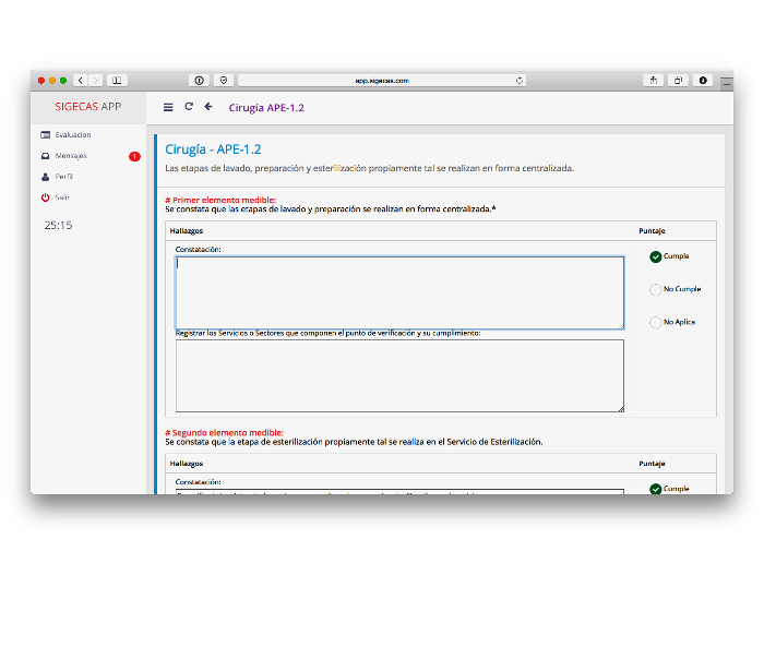 Una ventaja que no pasa inadvertida es la facilidad de uso de la plataforma comparado con el uso de formularios de papel fotocopiados. Para cada característica a evaluar se despliega el detalle de los elementos medibles a verificar en el punto asignado, y se accede a un campo de texto para ingresar los argumentos que respaldan el cumplimiento de los elementos medibles para cada lugar de verificación.